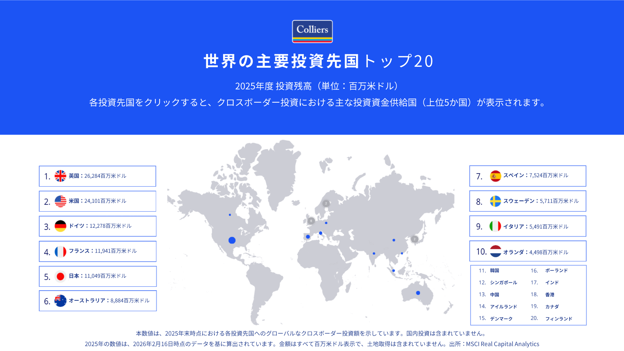本レポートでは、2025年通期の投資実績をもとに、地域別・セクター別の投資フロー、クロスボーダー資本の動向、資金調達環境の変化、ならびに2026年に向けたマクロ経済・金融環境の見通しについて、コリアーズ独自の分析と各種データを用いて整理しています。