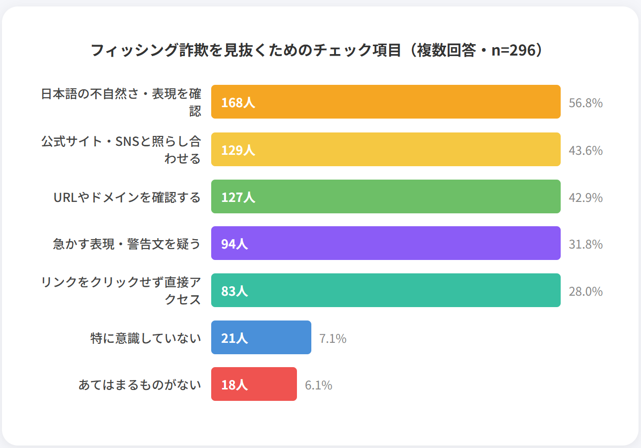 次いで「公式情報との照合」や「URLの確認」が4割を超えており、複数の視点で真偽を判断している様子がうかがえます。