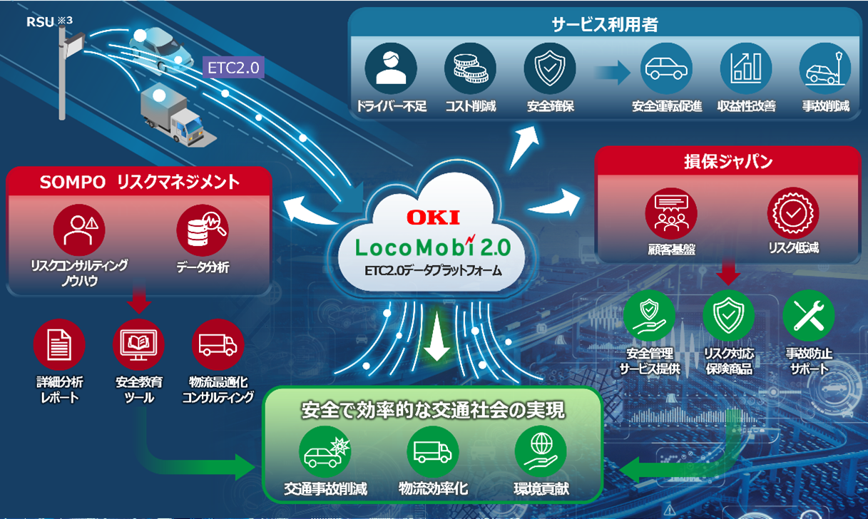 沖電気工業株式会社(本社:東京都港区、代表取締役社長執行役員:森 孝廣、以下「OKI」)、リスクマネジメント株式会社(本社:東京都新宿区、代表取締役社長:中村 隆久、以下「SOMPOリスク」)、損害保険ジャパン株式会社(本社:東京都新宿区、代表取締役社長:石川 耕治、以下「損保ジャパン」)の3社は、現在、ETC2.0のプローブデータ※1を活用したドライバーの管理・安全運転支援サービスの実証実験を共同で推進しています。2026年4月末に本実証実験を完了させ、本格リリースに向けた検討を開始します。本サービスは、既存のETC2.0車載器を活用し、中小規模事業者でも導入しやすい価格帯で提供することを目指しています。これにより、物流・運輸業界のドライバー不足や燃料費高騰といった課題の解決に貢献し、安全で効率的な輸送の実現を支援します。