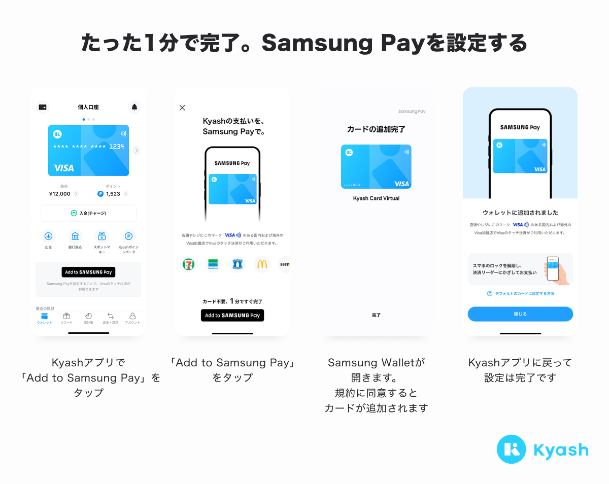 株式会社Kyash(本社:東京都港区、代表取締役社長:鷹取 真一、以下「Kyash」)は、 Samsung Pay を利用した、Kyash CardおよびKyash Card VirtualでVisaのタッチ決済サービスを開始することをお知らせいたします。これにより、Samsung Galaxy のスマートフォンをお持ちのKyash CardおよびKyash Card Virtual利用者さまは、日本国内および海外のVisaのタッチ決済対応加盟店において、より簡単、スピーディーかつ安全・安心にお支払いいただけるようになります。