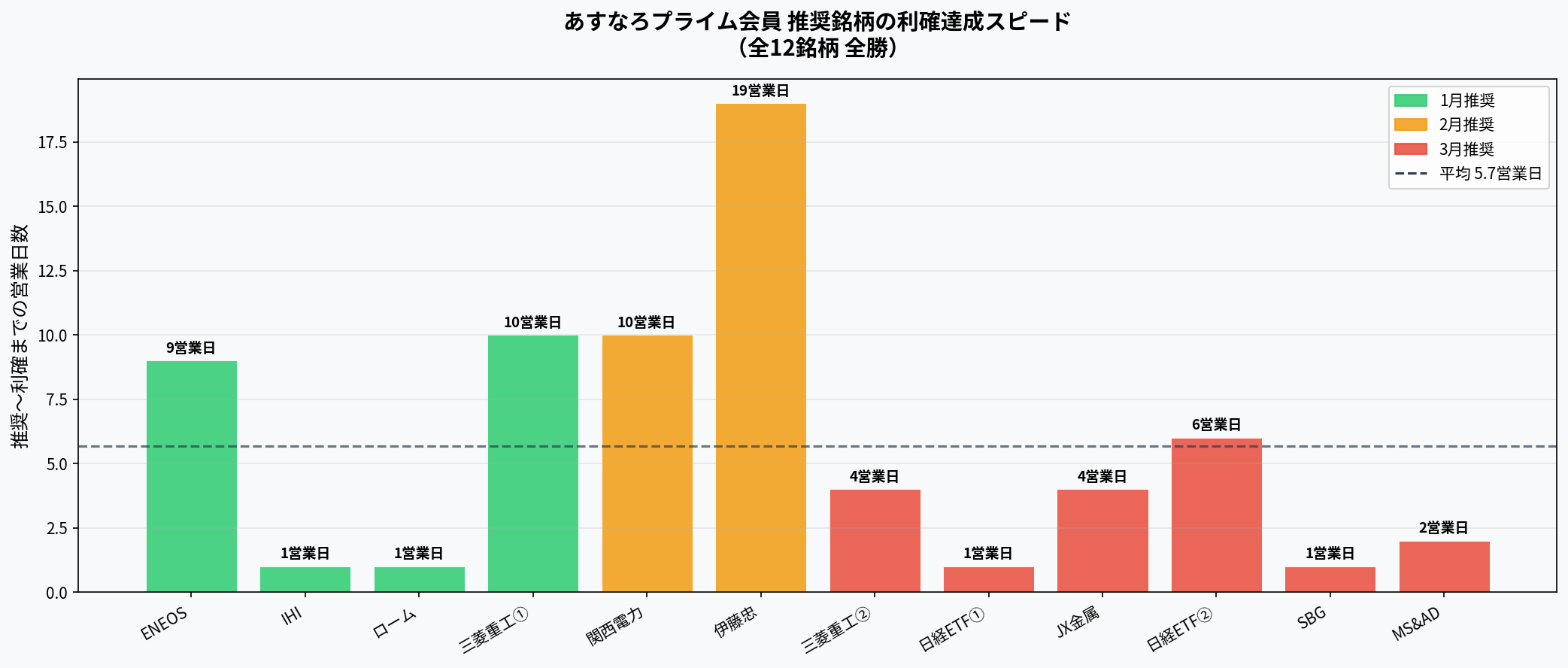 期間中に推奨された12銘柄の実績は以下の通りです。推奨から利確提言(または目標達成)までの平均営業日数はわずか3.5日と、極めて資金効率の高いトレードを実現しています。