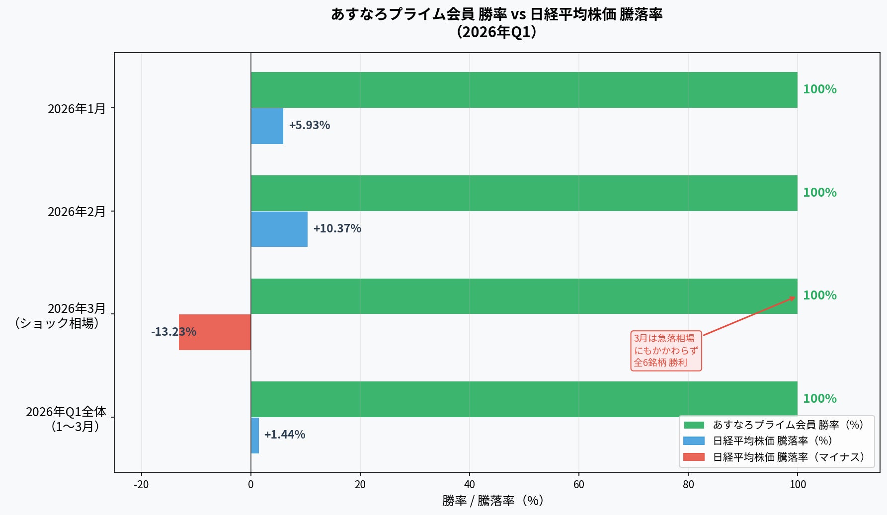 株式会社あすなろ(本社:東京都港区、代表取締役:大石やすし、以下「あすなろ投資顧問」)は、提供する売買助言サービス「あすなろプライム会員」において、2026年第1四半期(1月〜3月)に推奨した限定大型株全12銘柄のパフォーマンス分析結果を公表いたします。本期間は日経平均株価が3月に月間7.4%下落する急落局面(ショック相場)に見舞われましたが、あすなろ投資顧問の推奨銘柄は市場の荒波を跳ね返し、全銘柄で目標達成または利益確定の提言を行うという圧倒的な成果を収めました。