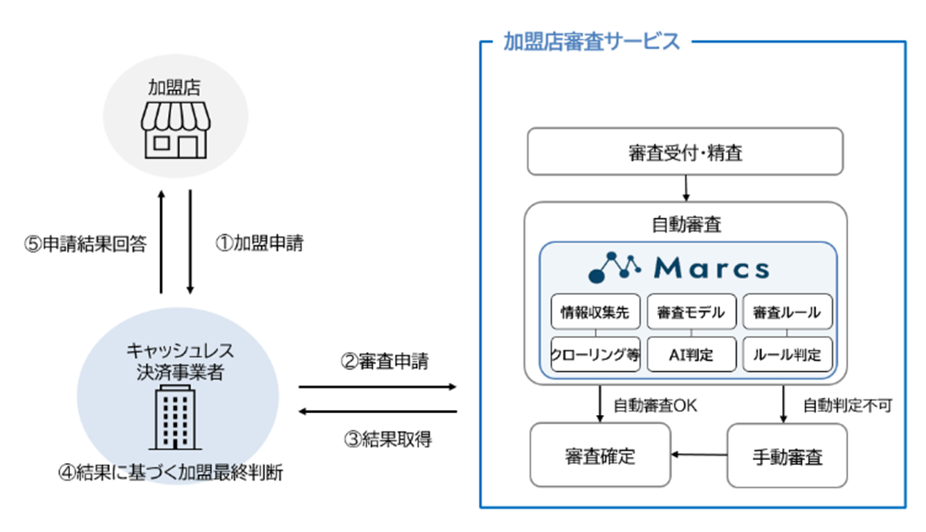 キャッシュレス決済事業者が、「Marcs」を活用した加盟店審査サービスを通じて加盟店審査の申請や自動審査・審査結果の閲覧を自社の環境で行うことができます。 |