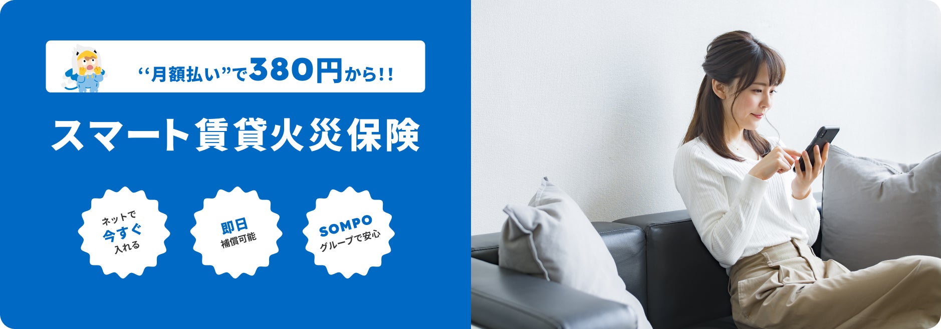 Mysuranceでは、賃貸住宅に必要な「借家人賠償(大家さんへの賠償)」や「家財の補償」、「個人賠償責任保険※(1億円まで補償)」等がセットされた、「スマート賃貸火災保険」を提供しています。詳しくは、Webサイトをご確認ください。
