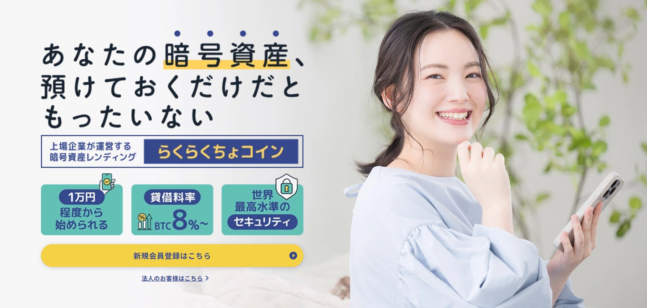 「らくらくちょコイン」は、暗号資産をすでに保有し、長期保有を前提に活用したい個人および法人を主な対象とした暗号資産 レンディングサービスです。日々の価格変動を追うことなく、手間をかけずに暗号資産を運用したいニーズや、少額から暗号資 産運用を始めたい初心者層から、中長期で暗号資産を保有する企業の資産活用ニーズまで、幅広い利用シーンを想定しています。 お客様が保有する暗号資産を本サービスに預け入れることで、預け入れ期間に応じた貸借料(利息)を受け取ることができます。