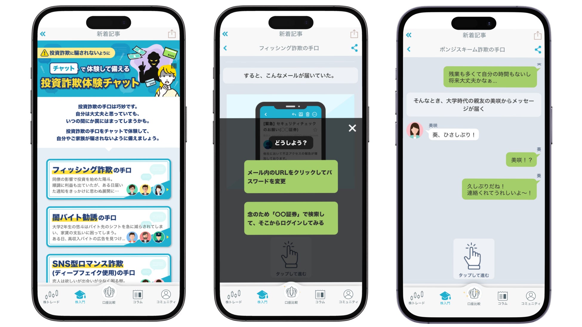 「投資詐欺体験チャット」は株たすアプリ内、また当社ホームページにて無料で公開しておりますので、ぜひご活用ください。