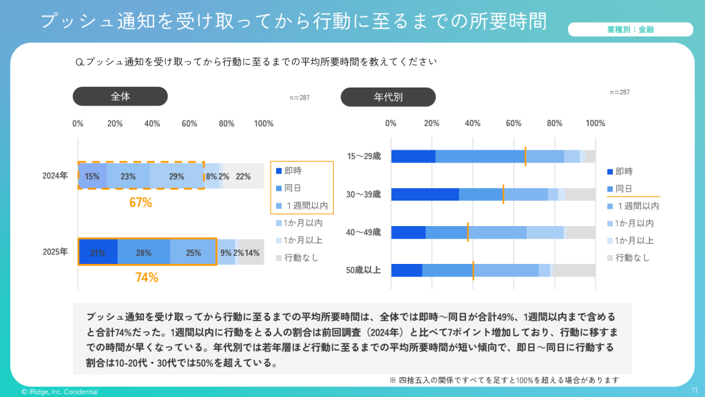 ・プッシュ通知を受け取ってから行動に至るまでの平均所要時間は、全体では即時~同日が合計49%、1週間以内まで含めると合計74%だった