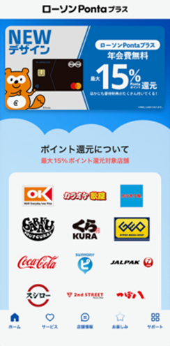 対象店舗での「ローソンPontaプラス」のご利用で、Pontaポイントをもれなく8%還元、各種条件達成で最大15%を還元いたします。