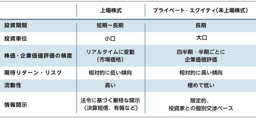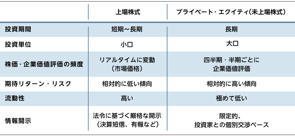 上場株式とプライベート・エクイティ(未上場株式)の一般的な違い