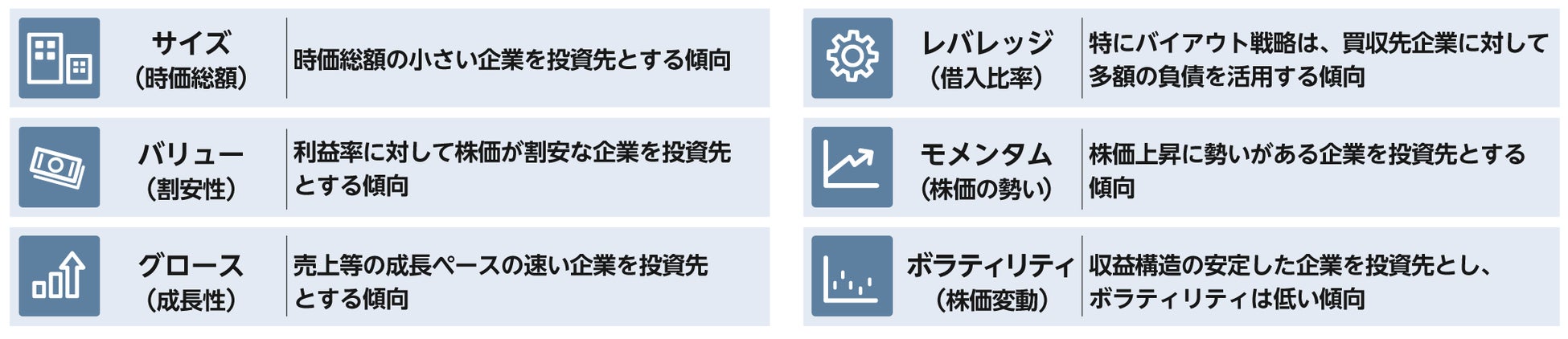 ●プライベート・エクイティ投資の相対的に高いリターンの一部は、国や業種の配分比率や、複数の「投資スタイル」*で説明できると考えられ、それらを上場株式を組み合わせて再現します。