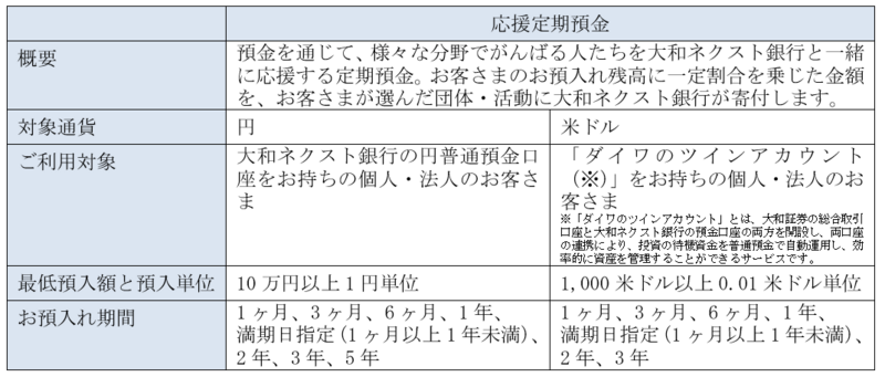 ●「応援定期預金」の商品概要 (詳しくは大和ネクスト銀行のウェブサイトをご確認ください)