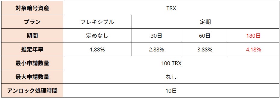 この度、日頃よりご愛顧いただいているお客さまへの感謝の気持ちを込めて、TRX(トロン)のステーキングにおける新たなプランをご提供いたします。
