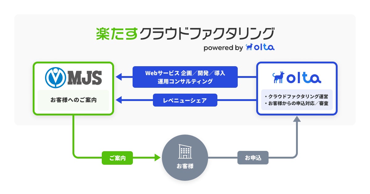 日本初※のオンライン型ファクタリングサービス「OLTAクラウドファクタリング」を提供するOLTA(オルタ)株式会社(代表取締役社長兼CEO:澤岻 優紀、以下「OLTA」)は、株式会社ミロク情報サービス(代表取締役社長:是枝 周樹、以下「MJS」)と提携し、2026年4月20日よりクラウドファクタリング事業「楽たすクラウドファクタリング powered by OLTA」の提供を開始します。