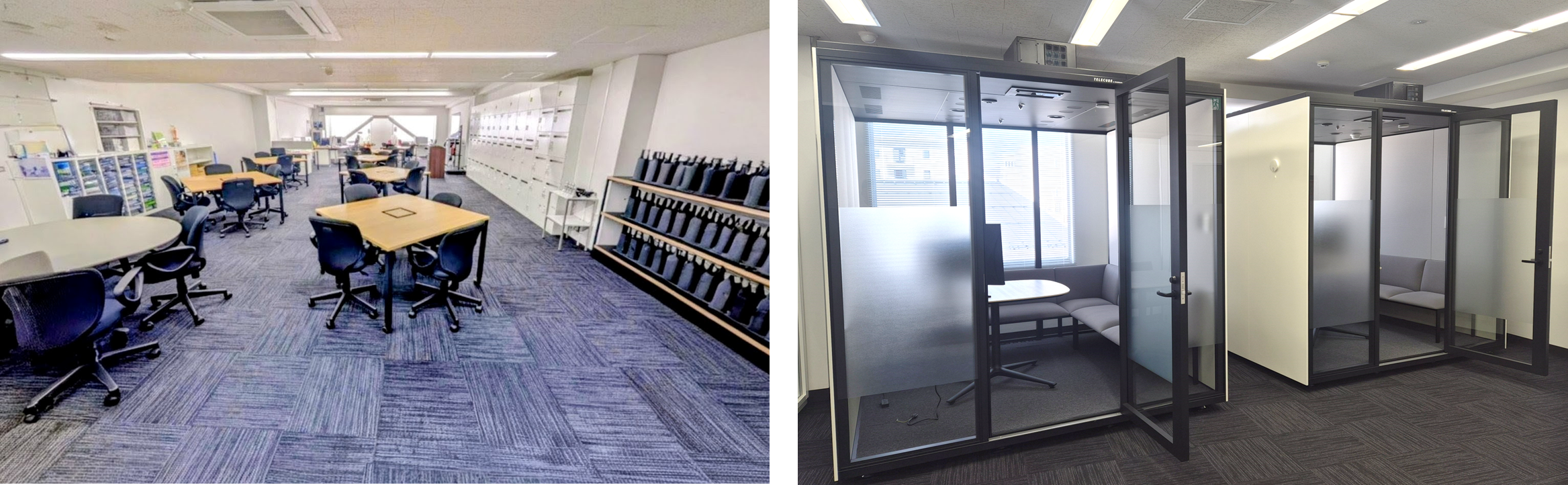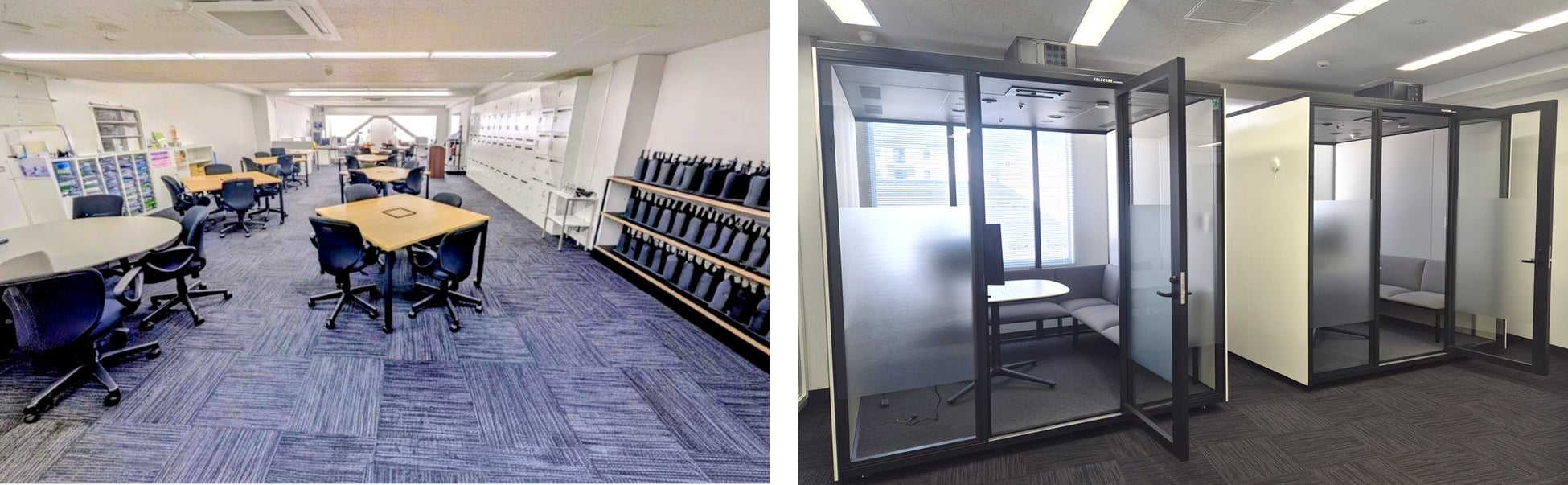 (左から)遠隔営業所の第1号店となる長野支社松本営業所のオフィスの様子、プライベート空間に配慮した接客ブース