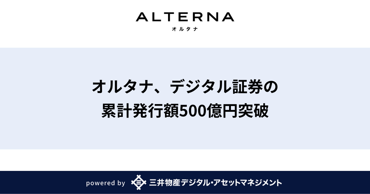 三井物産デジタル・アセットマネジメント株式会社(以下「当社」)は、当社が提供するオルタナティブ投資サービス「ALTERNA(オルタナ)」において、デジタル証券(セキュリティ・トークン)の累計発行額が500億円を突破したことをお知らせします。なお当社以外の証券会社経由も合わせた累計発行額は750億円を突破しています。