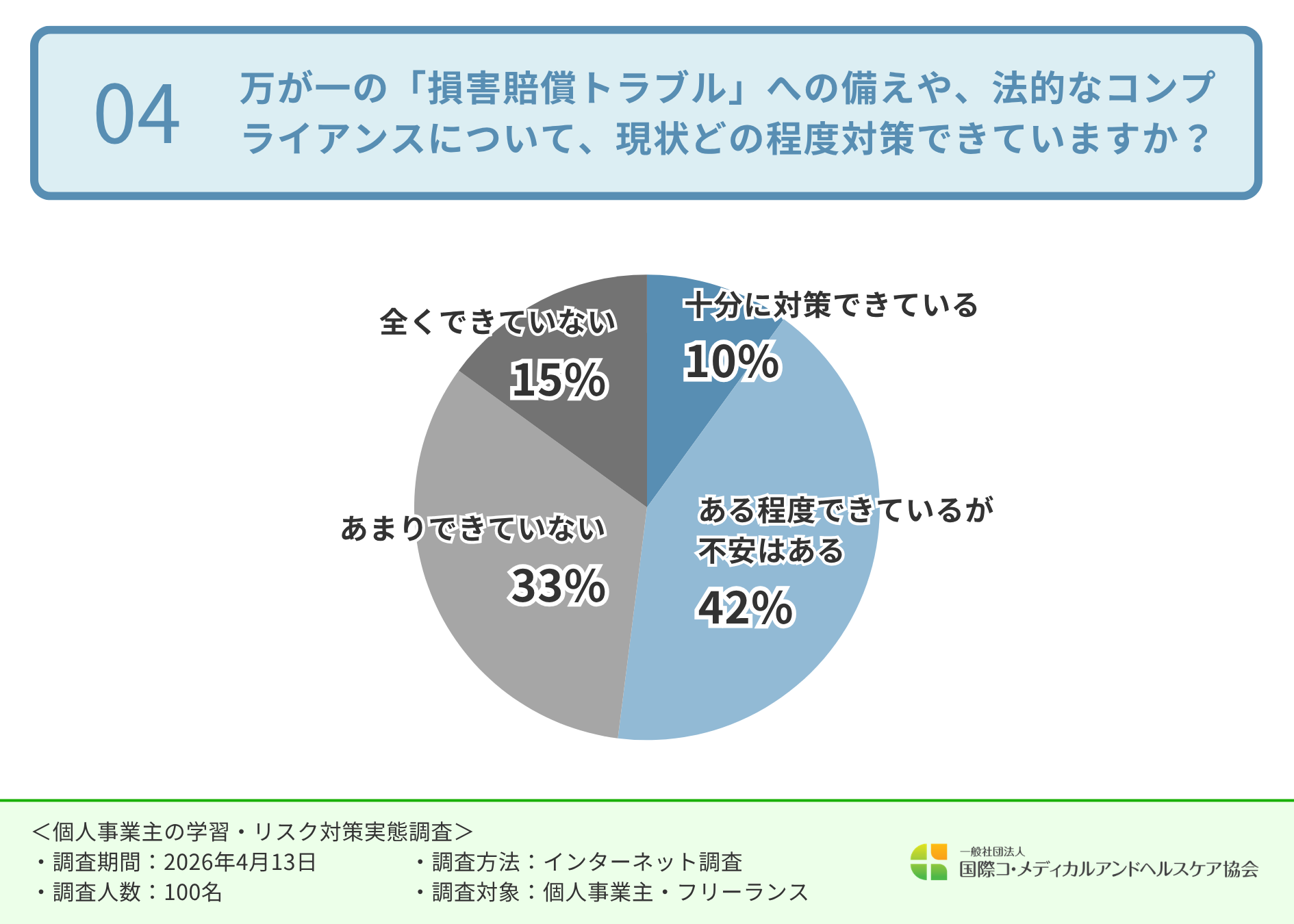 学習を進めることで事業の守りにつながることもありますが、万が一の「損害賠償トラブル」への備えや、法的なコンプライアンスについて、現状どの程度対策できているのでしょうか?