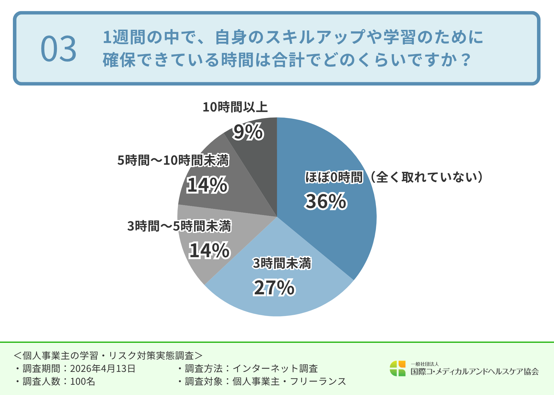 一般社団法人国際コ・メディカルアンドヘルスケア協会(ICHA)(https://icha.jp/)(所在地:神奈川県川崎市、代表理事:飯田 正人)は、個人事業主・フリーランスを対象に「個人事業主の学習・リスク対策の実態」に関する調査を実施しました。
