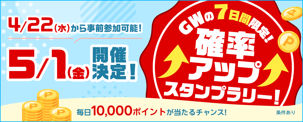 ※「GW限定!毎日1万ポイントのチャンス!確率アップスタンプラリー!」キャンペーン