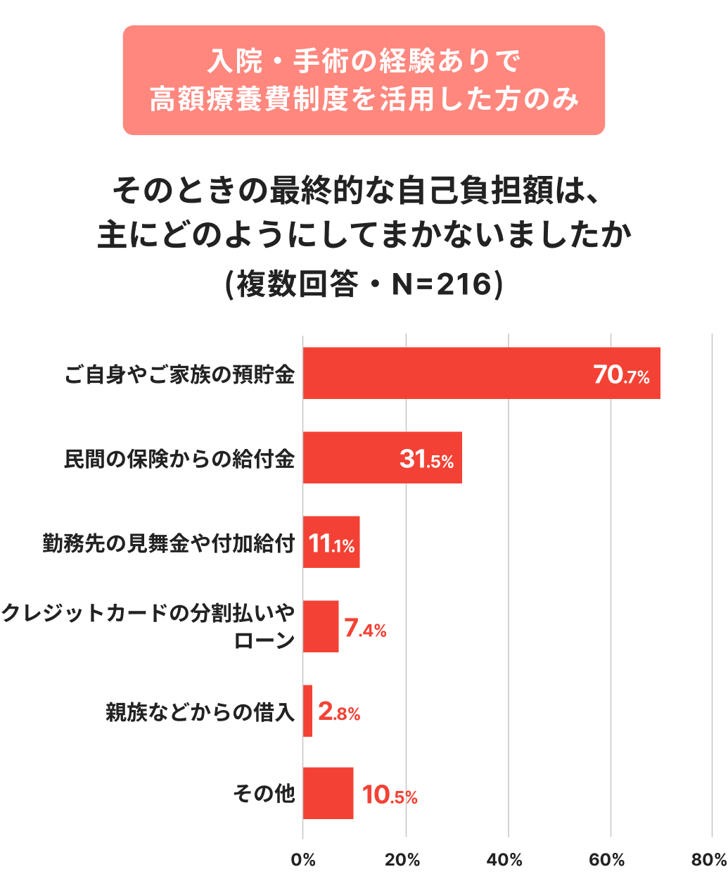 いざという時の自己負担額のまかない方について尋ねたところ、トップは「ご自身やご家族の預貯金」で圧倒的な70.7%を占めました。一方で、「民間の医療保険・がん保険からの給付金」を活用した人は31.5%にとどまっています。多くの人が手元の現金で支払いをしている実態がわかりましたが、7.4%の人が「クレジットカードの分割払いやローン」に頼らざるを得ない状況にあることも判明しました。
