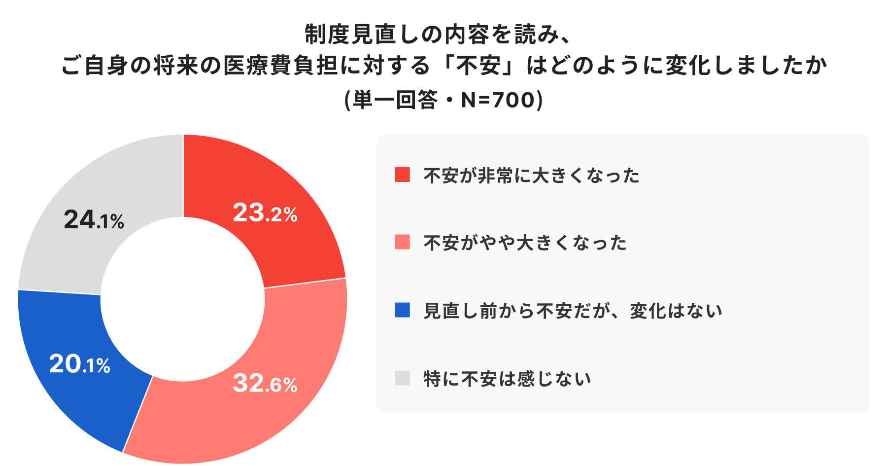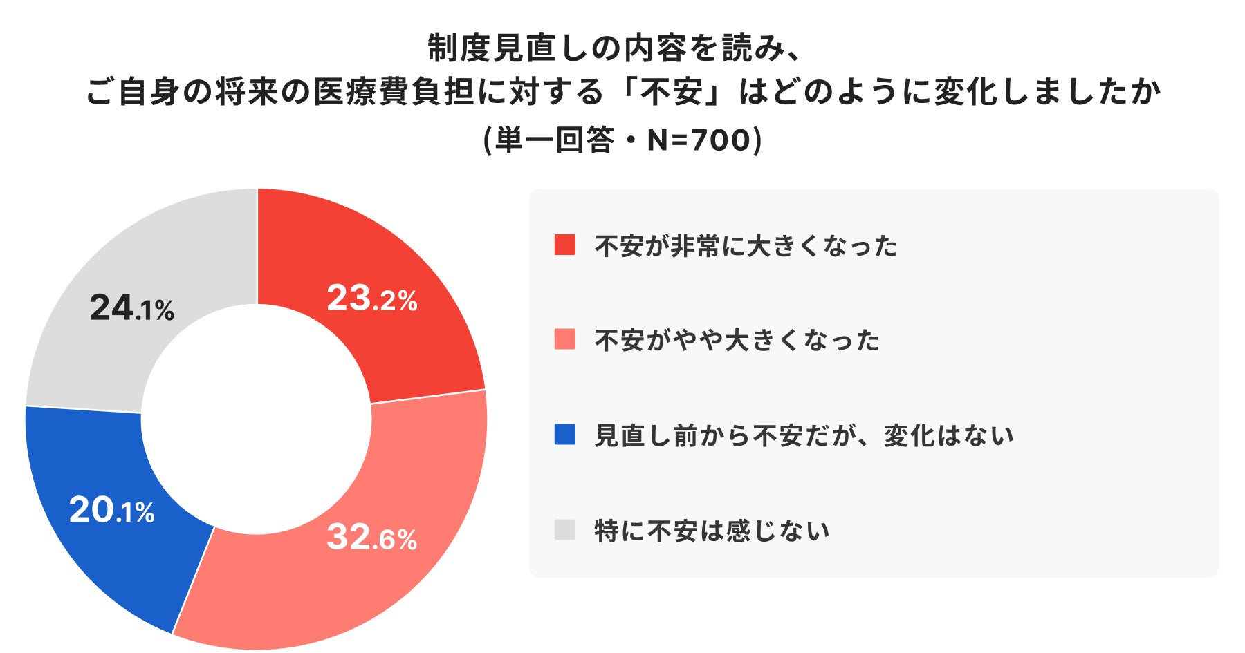 制度見直しの内容を伝えたところ、55.8%(「非常に大きくなった」23.2%+「やや大きくなった」32.6%)の人が将来の医療費に対する不安が大きくなったと回答しました。