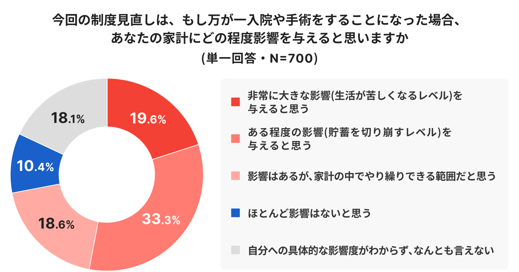 万が一入院や手術をした場合、今回の制度見直しが家計へ与える影響について聞いたところ、過半数の52.9%が「貯蓄を切り崩すレベル」(33.3%)あるいは「生活が苦しくなるレベル」(19.6%)の深刻な影響があると考えていることがわかりました。