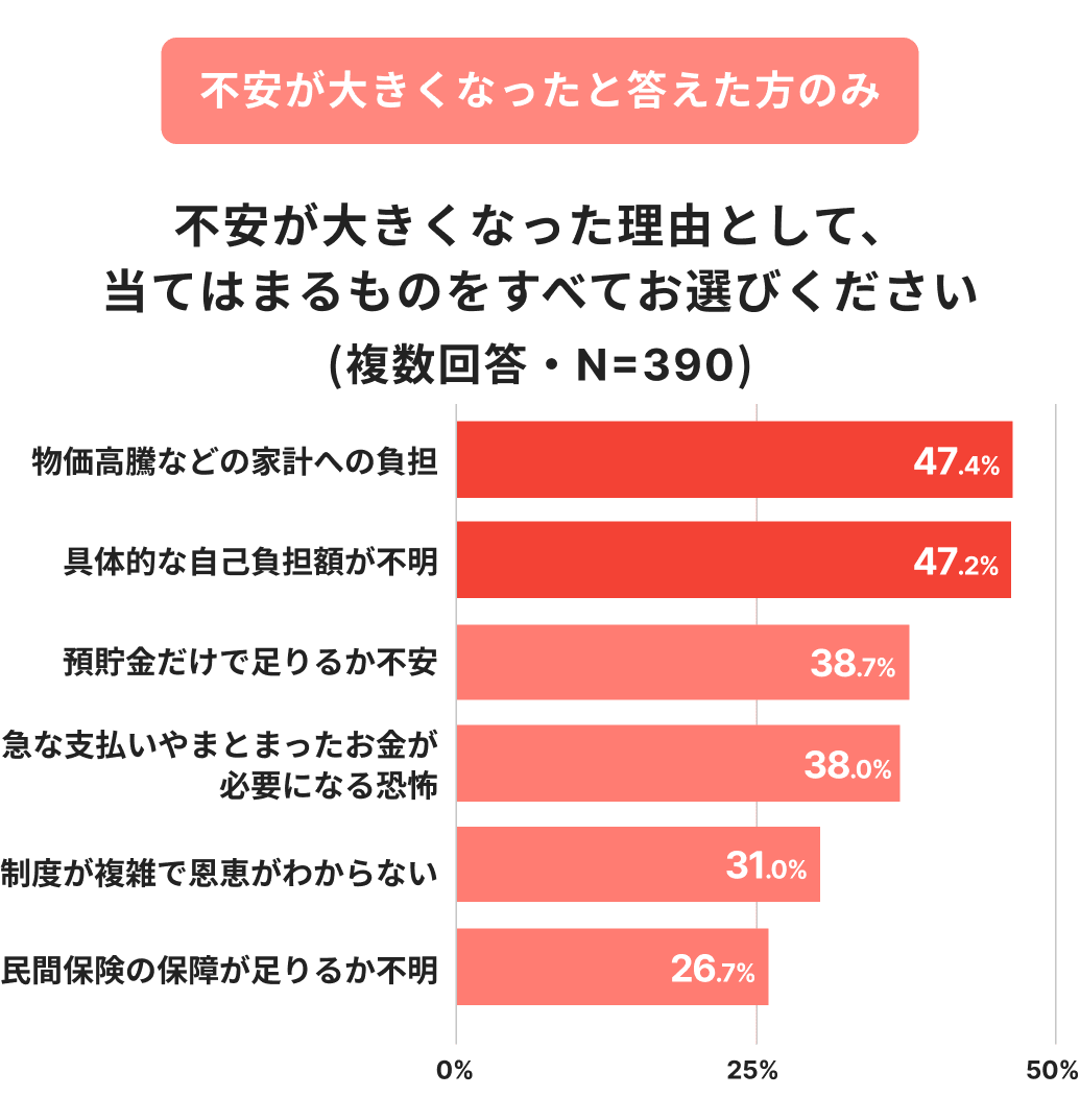 不安が大きくなった理由のトップ2は、「物価高騰などの家計への負担」(47.4%)と、「具体的な自己負担額が不明」(47.2%)でした。次いで「預貯金だけで足りるか不安」という声も38.7%にのぼっています。