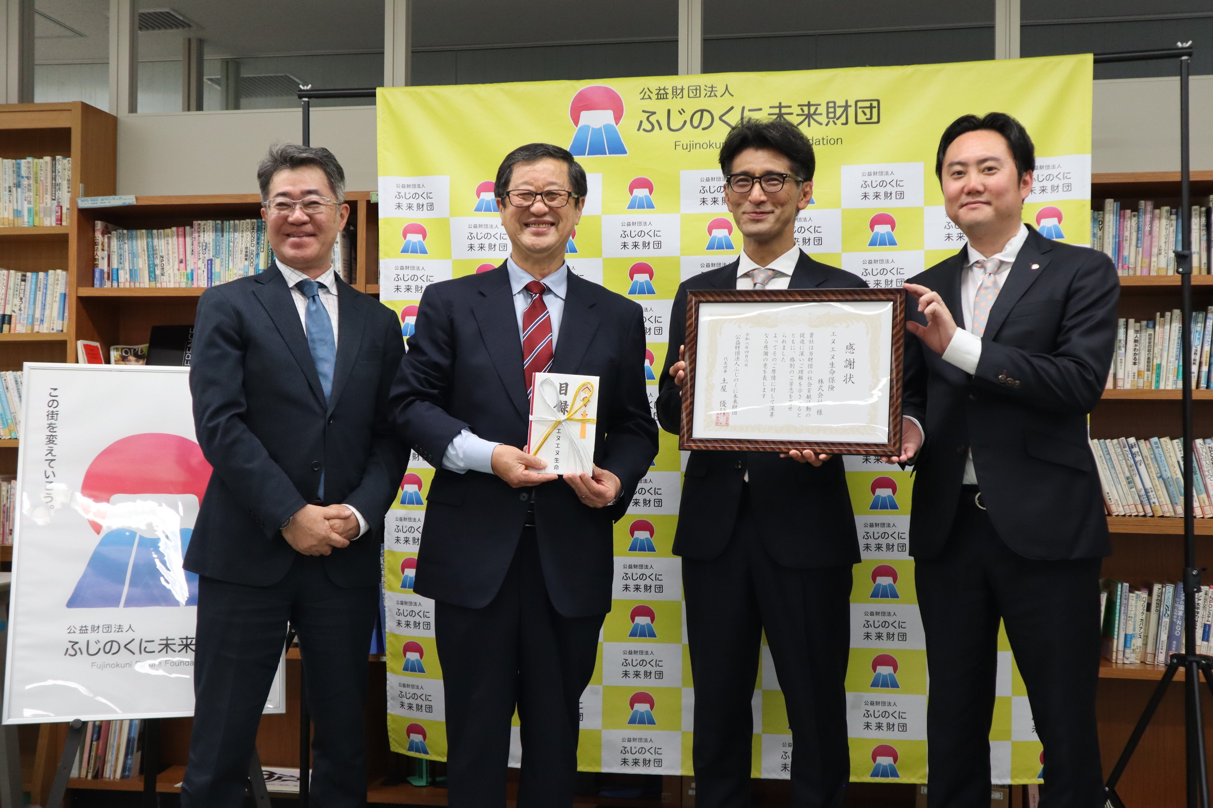 ふじのくに未来財団 副代表理事 都築直人 氏、同 代表理事 土屋優行 氏、エヌエヌ生命 関西・中部エリア統括部長 原田健司、同 静岡営業部長 田杉朗太