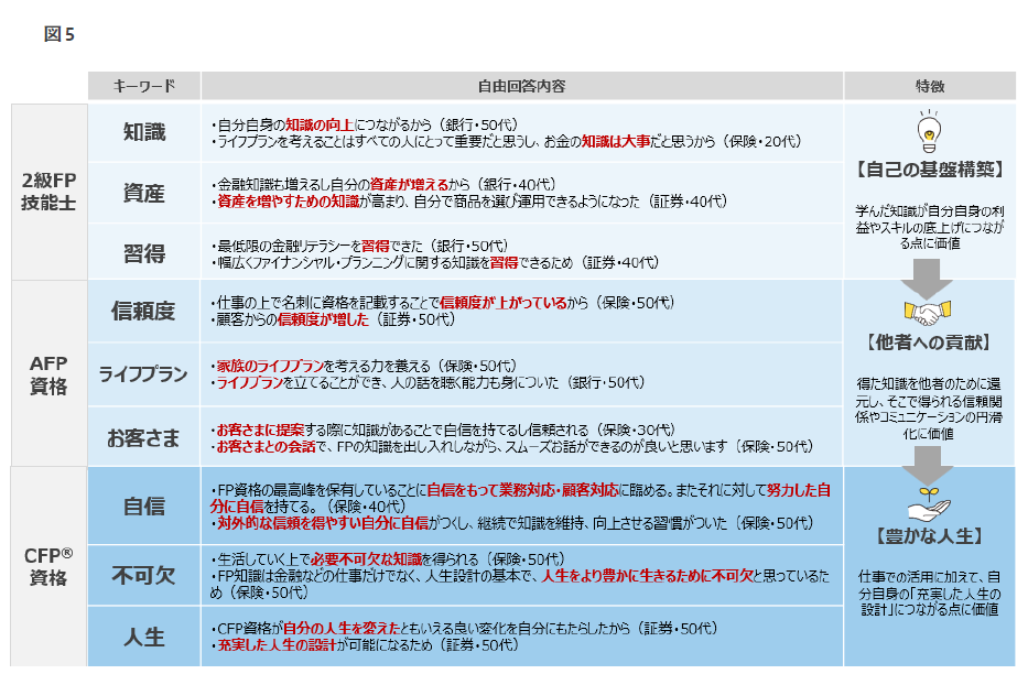 ■自由回答より、有用性を感じる背景には、各段階で明確な特徴がみられる。2級FP技能士は自身のスキルアップを目的とした「自己の基盤構築」が中心だが、AFP資格では「他者への貢献」(顧客の信頼や家族のライフプラン)へと視座が広がっている。上級資格のCFP資格においては、「不可欠」「人生」といったキーワードが象徴するように、 資格が単なる仕事のツールを超え、自身の豊かな人生を設計するうえで必要なものとなっている。(図4.5)