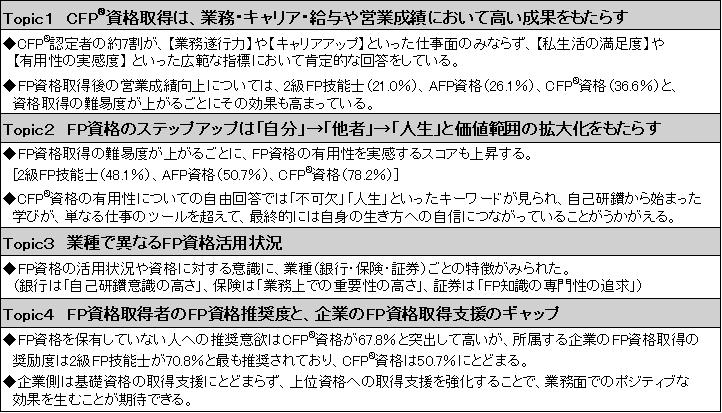 調査の結果、FPの上級資格であるCFP資格の取得が業務遂行力やキャリアアップ、給与、営業成績において他のFP資格を大きく上回る成果を出しており、資格取得の難易度が上がるごとに、業務面のみならず私生活の面でも有用性を実感していることがわかりました。また、CFP資格は他のFP資格と比較して他者への推奨意欲が突出して高いものの、企業の資格取得の支援が少なく、企業側が上位資格への取得支援策を強化することは、業務面でポジティブな効果を生むことが期待できるとわかりました。