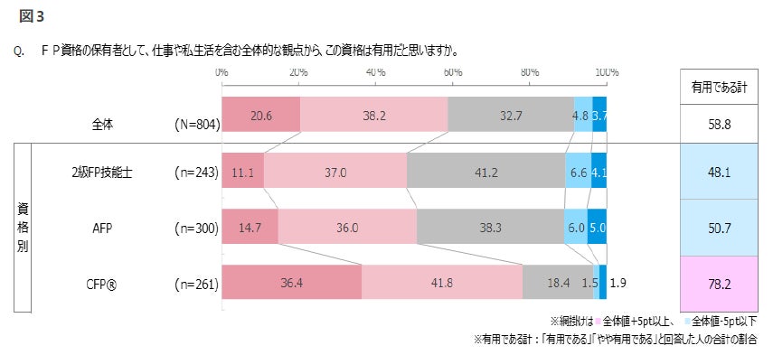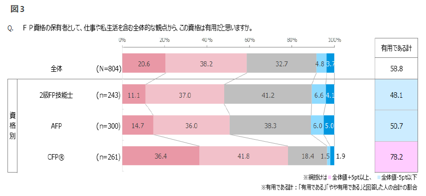■資格の有用性の実感度は2級FP技能士(48.1%)、AFP資格(50.7%)、CFP資格(78.2%)と、資格の難易度が 上がるごとにスコアも上回る。(図3)