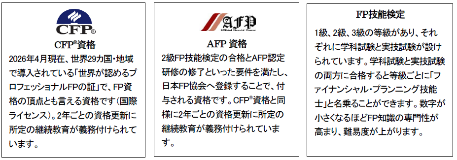 FP資格には、日本FP協会が認定する「CFP資格」(FPの上級資格)および「AFP資格」と、国家検定である「FP技能士」(1~3級)があります。