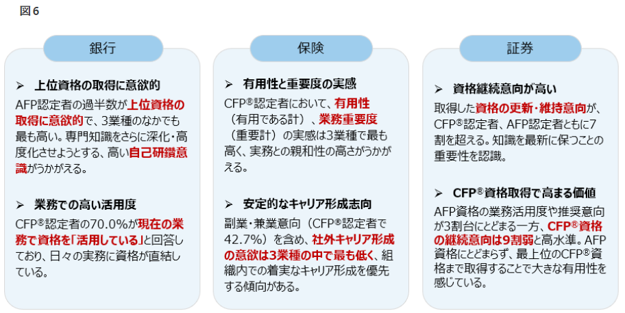 ■金融機関(銀行・保険・証券)において、FP資格の活用状況や資格に対する意識に業種ごとの特徴がみられた。(図6)