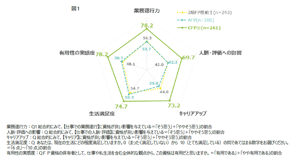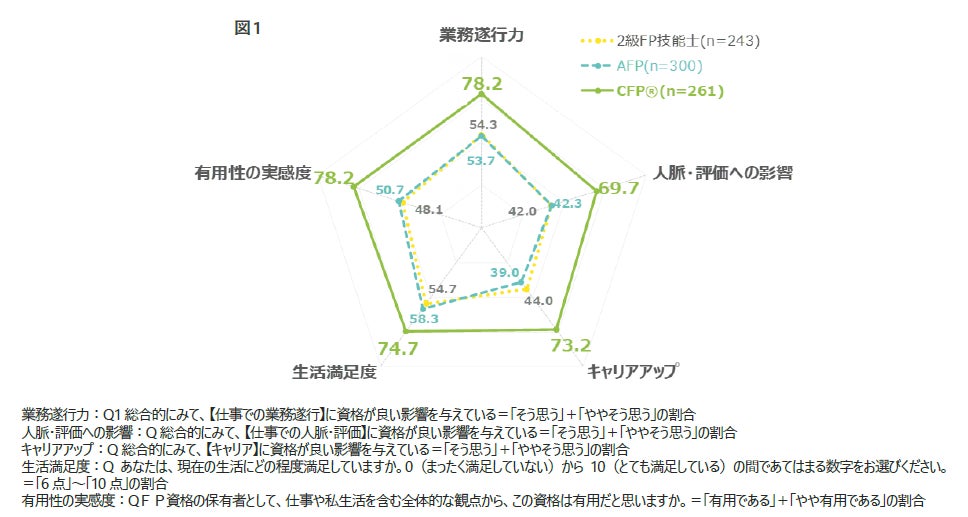 ■【生活満足度】についてはCFP資格が最も高い(74.7%)一方で、2級FP技能士(54.7%)やAFP資格(58.3%)でも半数以上が肯定的に回答しており、資格間でのスコア差が他の項目に比べて最も小さい。資格のレベルを問わず、FP資格の取得自体が生活において一定の満足感をもたらすことが示唆される。(図1)