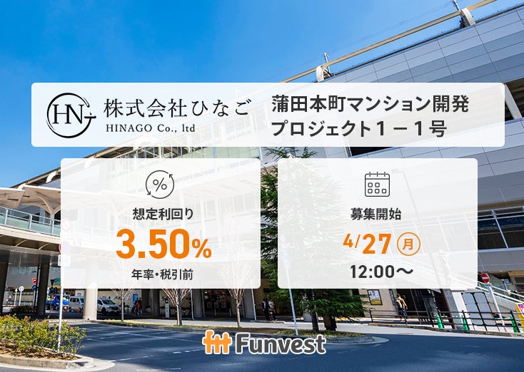資産を「着実に」育てる「Funvest(ファンベスト)」(以下、Funvest)は、「ひなご 蒲田本町マンション開発プロジェクト1-1号」(以下、本ファンド)の募集を4/27より開始しますので、お知らせいたします。