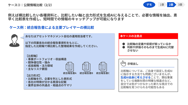 当社では、生成AIチャットツールの全社展開を起点に、業務への適用と社内浸透を段階的に進めてきました。その中で、実務に即した活用方法に加え、生成AI利用に関するガバナンスやコンプライアンスへの理解を全社で高める必要性を認識しています。本教材は、資産運用業務の実態を踏まえ、社員一人ひとりが自身の業務と結び付けて学べる内容となっており、生成AI活用リテラシーの定着と活用の質の向上を通じて、お客さまへの更なる価値提供に繋げていきたいと考えています。