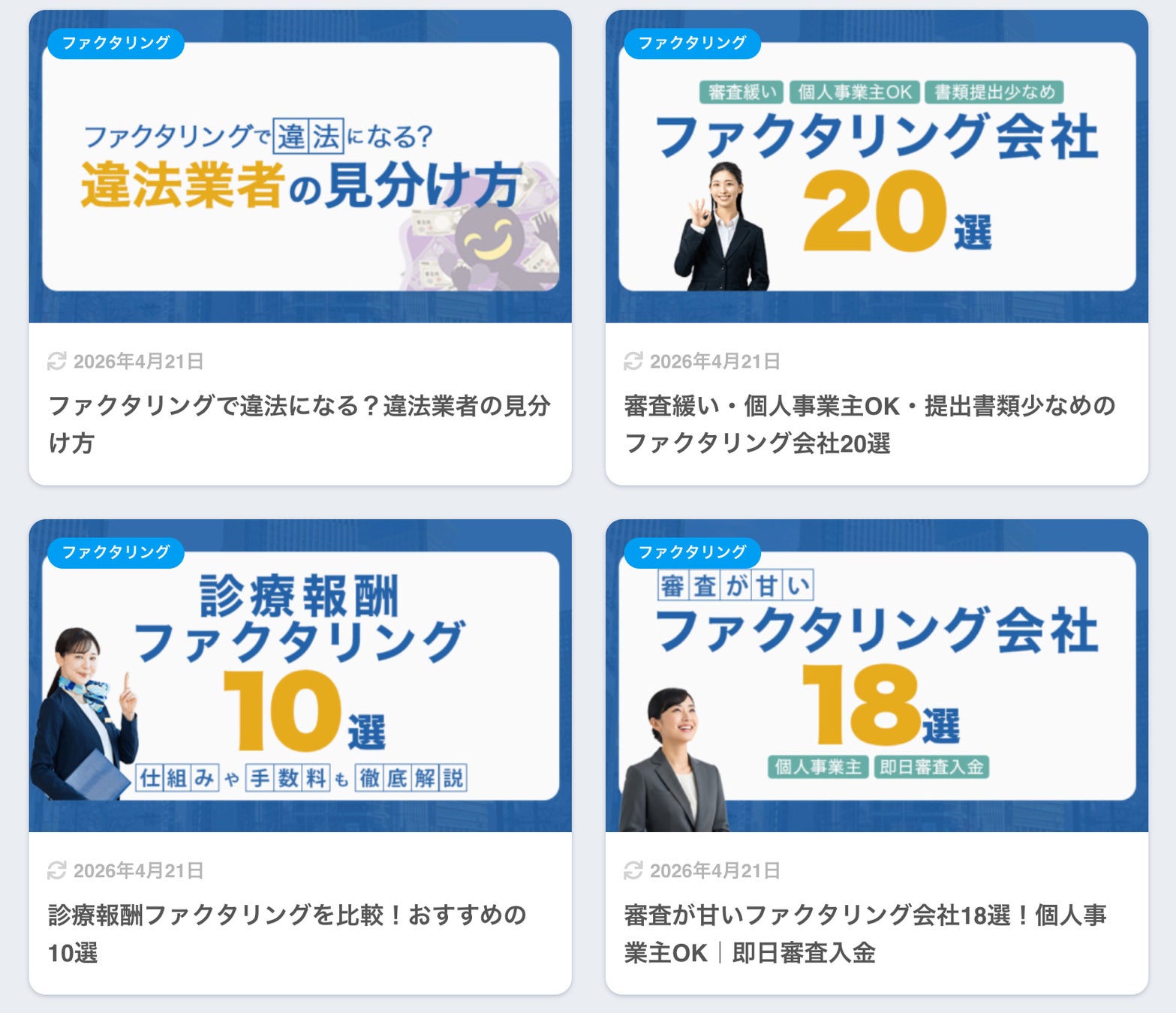 「ファクタリングガイド」では、こうした分析結果をもとに、以下のようなコンテンツを提供しています。
