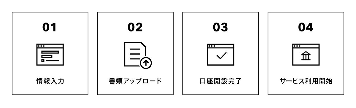※ 審査の過程で担当者よりWeb面談形式にて、事業内容や商取引の状況などについて確認させていただく場合があります。 また、審査の結果、口座開設の申し出をお断りすることがあります。
