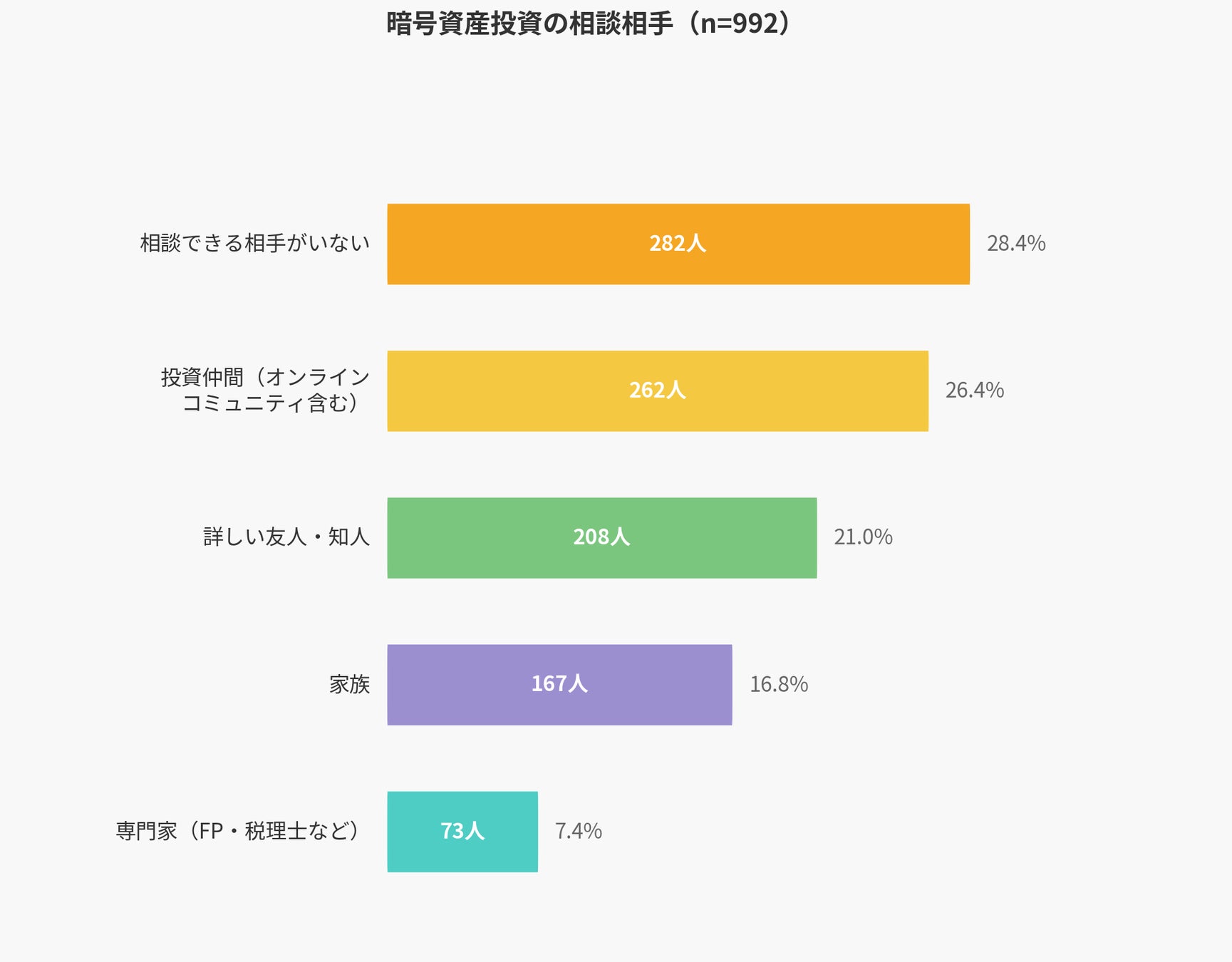 暗号資産投資における相談相手の有無を調査したところ、「相談できる相手がいない」と回答した人が28.4%で最も多い結果となりました。