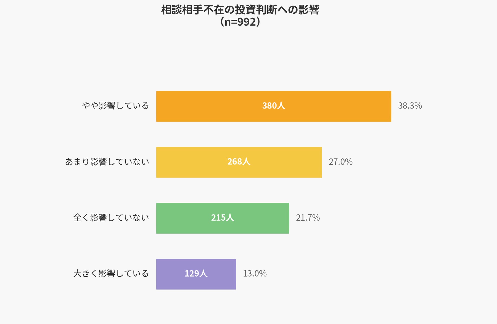 性別による比較では、女性の方が相談相手の不在を自身の投資判断に結びつけて考える割合が高いことが判明しました。