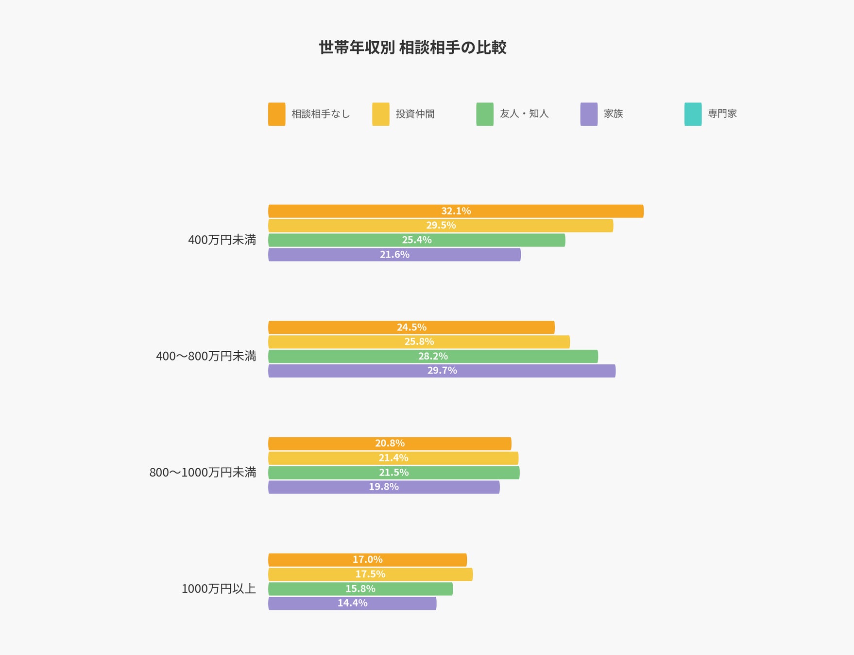 世帯年収別に相談相手を分析すると、年収が高くなるにつれて「専門家」を活用する割合が顕著に上昇する傾向が確認されました。