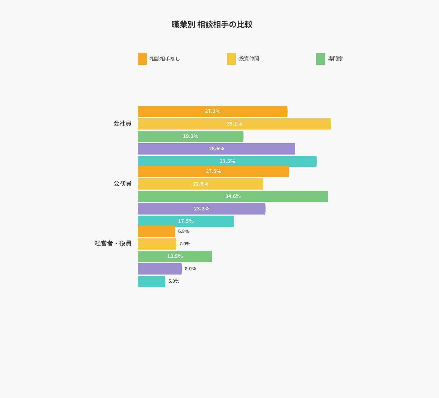 一方で「経営者・役員」は相談相手がいない割合が19.2%と最も低く、投資仲間や専門家との繋がりを強固に持っています。