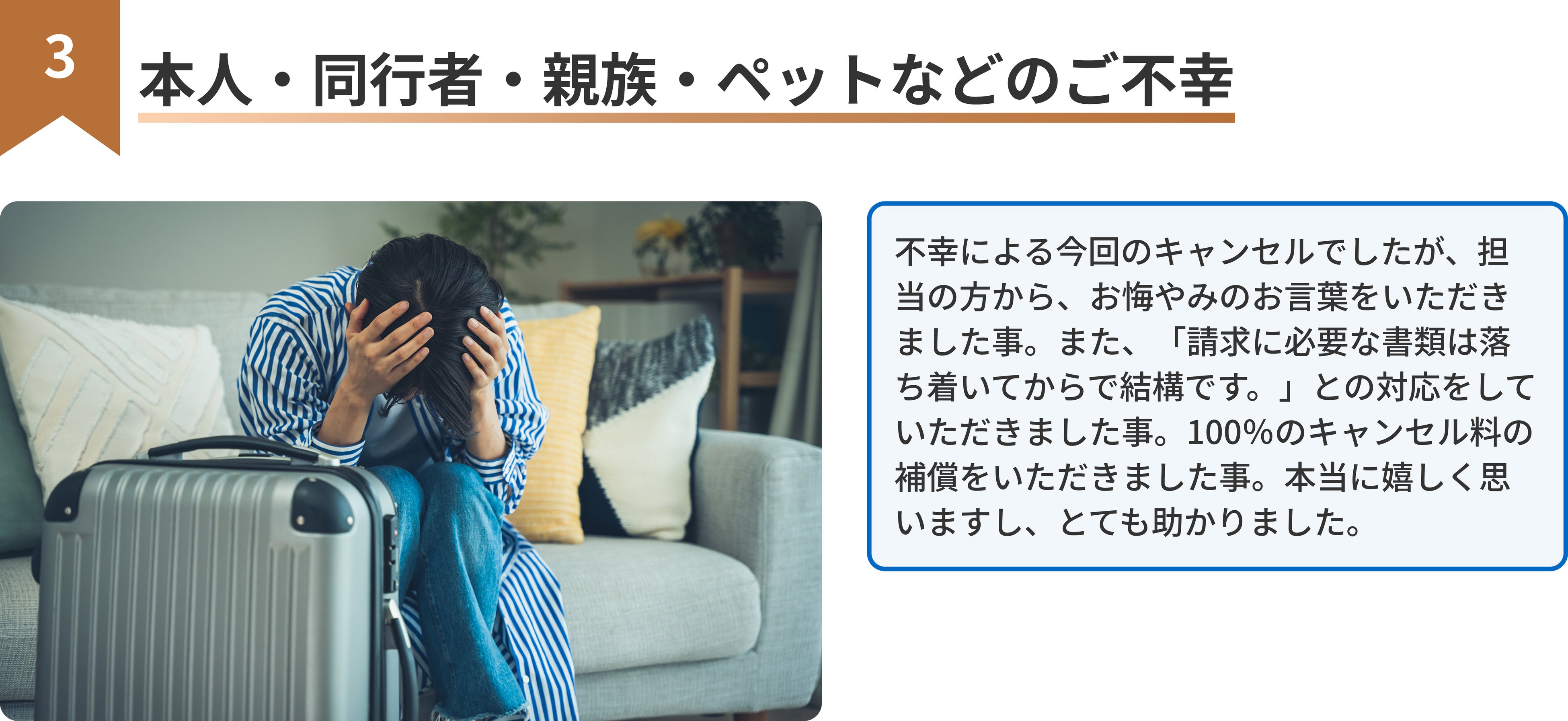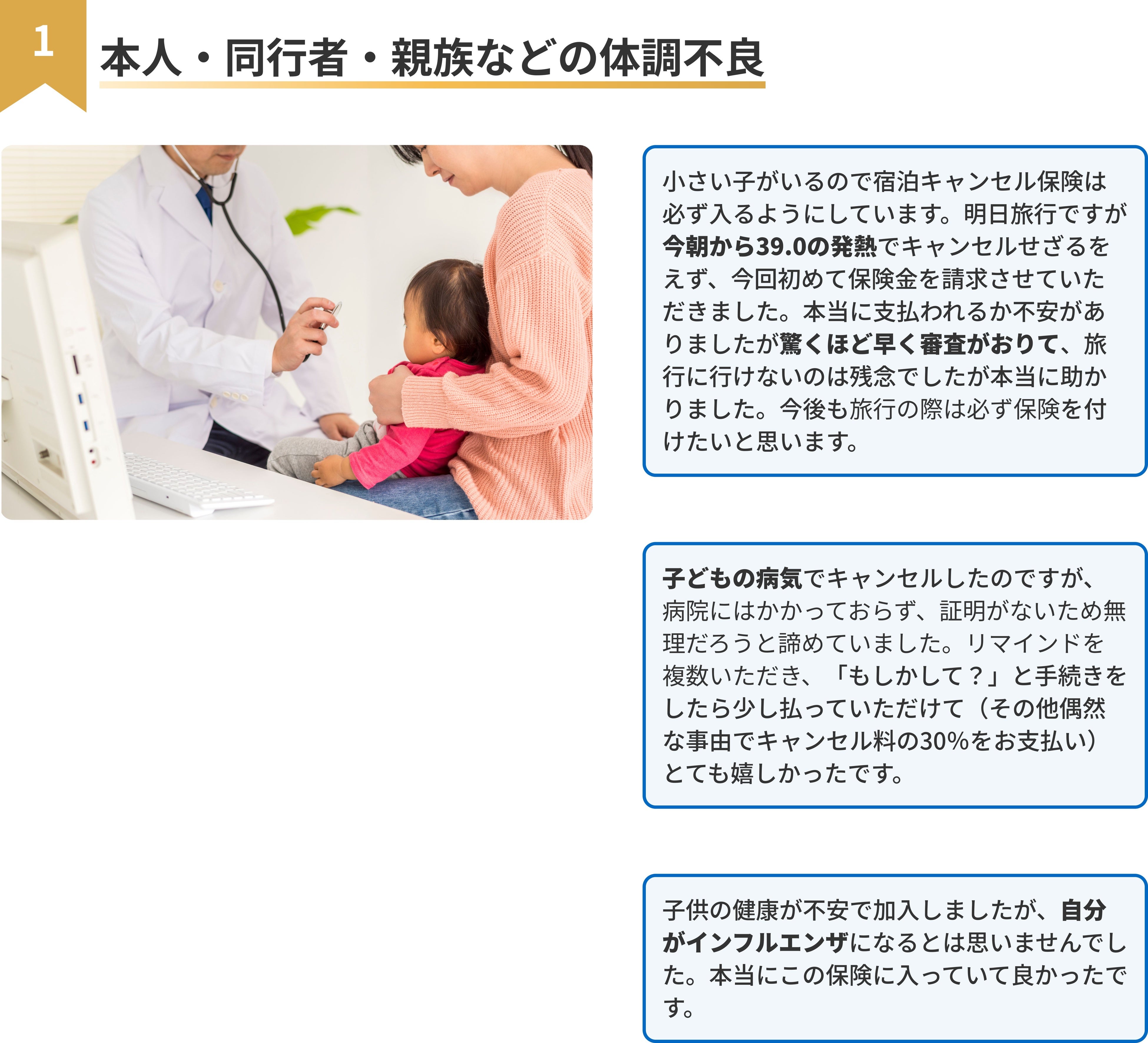 ユーザーからは、「子どもの発熱で旅行を断念したが、迅速に保険金が支払われ助かった」「急な家族の事情でも補償され安心した」「自分のインフルエンザで利用し、加入していて良かった」といった声が数多く寄せられています。