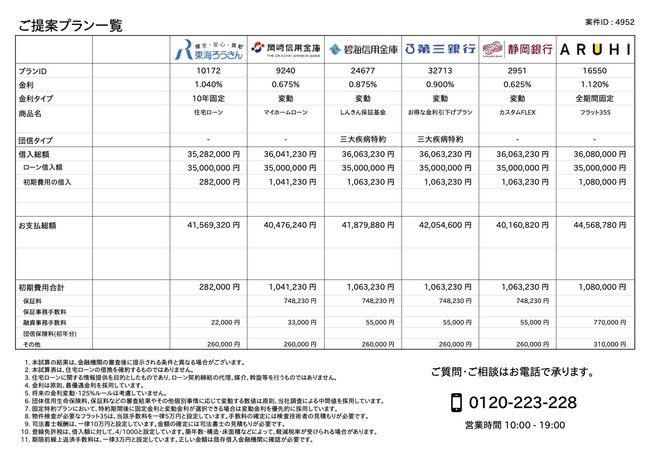 物件所在地から利用可能なあらゆる住宅ローンプランを網羅。総返済額が最も抑えられるプラン、ガン団信特約付きプランを抽出するなど様々な条件でお客様の要望にマッチするローンプランを瞬時に抽出し、他プランとの比較ができます。