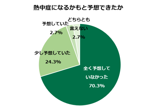 「わが子が熱中症になるかもしれないと予想できたか?」の質問に対しては、7割の方が「全く予想していなかった」と回答しました。