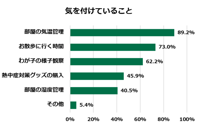 過去の熱中症の経験から、わが子を守るために改めて意識していることや、気を付けていることを聞いたところ、最も多かったのが「部屋の気温管理」で89.2%でした。熱中症のおよそ半数が自宅内で起きていることもあり、まずは部屋の気温を徹底して管理する方が多いということがわかります。