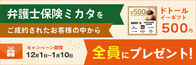 対象期間中に弁護士保険ステーション経由で、ミカタ少額短期保険株式会社「弁護士費用保険ミカタ」の契約申込を完了し、ご契約が成立されたお客様全員に、「ドトール イーギフト(500円)」をプレゼントします。