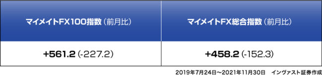 11月のマイメイトFX100指数は月初から調子を崩し続けて、最終的には先月比で-227.2pipsという結果を残しました。