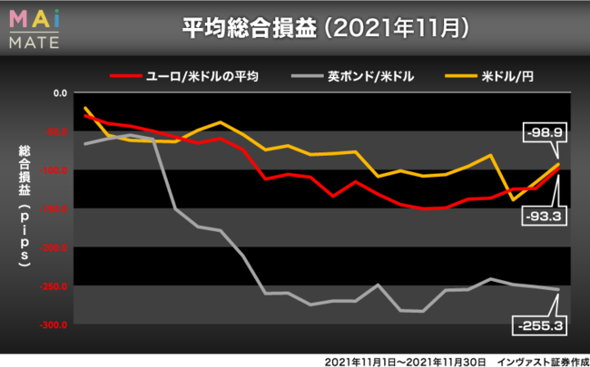 主要3通貨ペアの11月の平均総合損益(実現損益+評価損益)グラフを確認していきます。