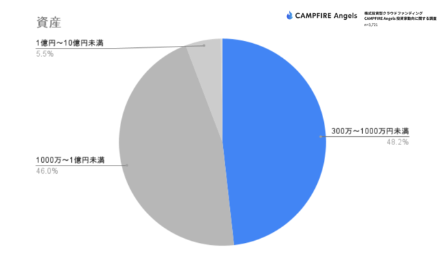 登録投資家の職業・年齢の平均年収と考えられる「500-1,000万円」、資産もそれに準ずる「300-1,000万円」が最も多い回答となりました。「1000万円~1億円」もほぼ同じ割合の回答数となり、資産の多い投資家の方にも株式投資型クラウドファンディングが広がっていると考えられます。
