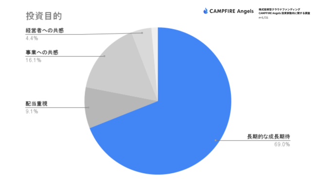 登録投資家の投資目的は、69%が「長期的な成長期待」と回答し、次いで16.1%が「事業への共感」となりました。